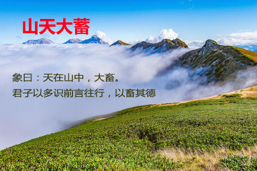 象曰:上卦为艮为山,下卦为乾为天,山峰屹立,高耸入云,就像山在天的上边,称作大蓄卦。君子就像站在山顶瞭望一样,对于前贤的一言一行,尽收眼底,用以丰富自己的见识。