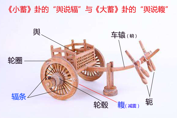 ①舆说輹:车箱与车轴之间的木块掉了下来。舆,车箱(厢)。说,通“脱”,脱落。輹,读“富”,即垫在车箱和车轴之间的木块。上面承载车箱,下面呈弧形,架在轴上,古称“车伏兔”,如同现在的减震。②中无尤也:坐在车厢内不会出现严重的问题。中,下卦中爻,指车厢内。尤,严重。