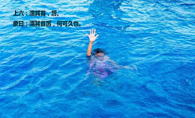 上六爻是全卦最上爻,表示头部。上六爻在坎卦,坎为水,所以说“濡其首”。