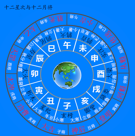 上图,是十二星次与十二月将圆图。为了清楚明白,可以略过,直接查阅下面图表。