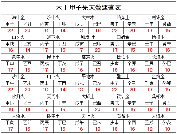 先天数:甲己子午九、乙庚丑未八、丙辛寅申七、丁壬卯酉六、戊癸辰戌五、巳亥四