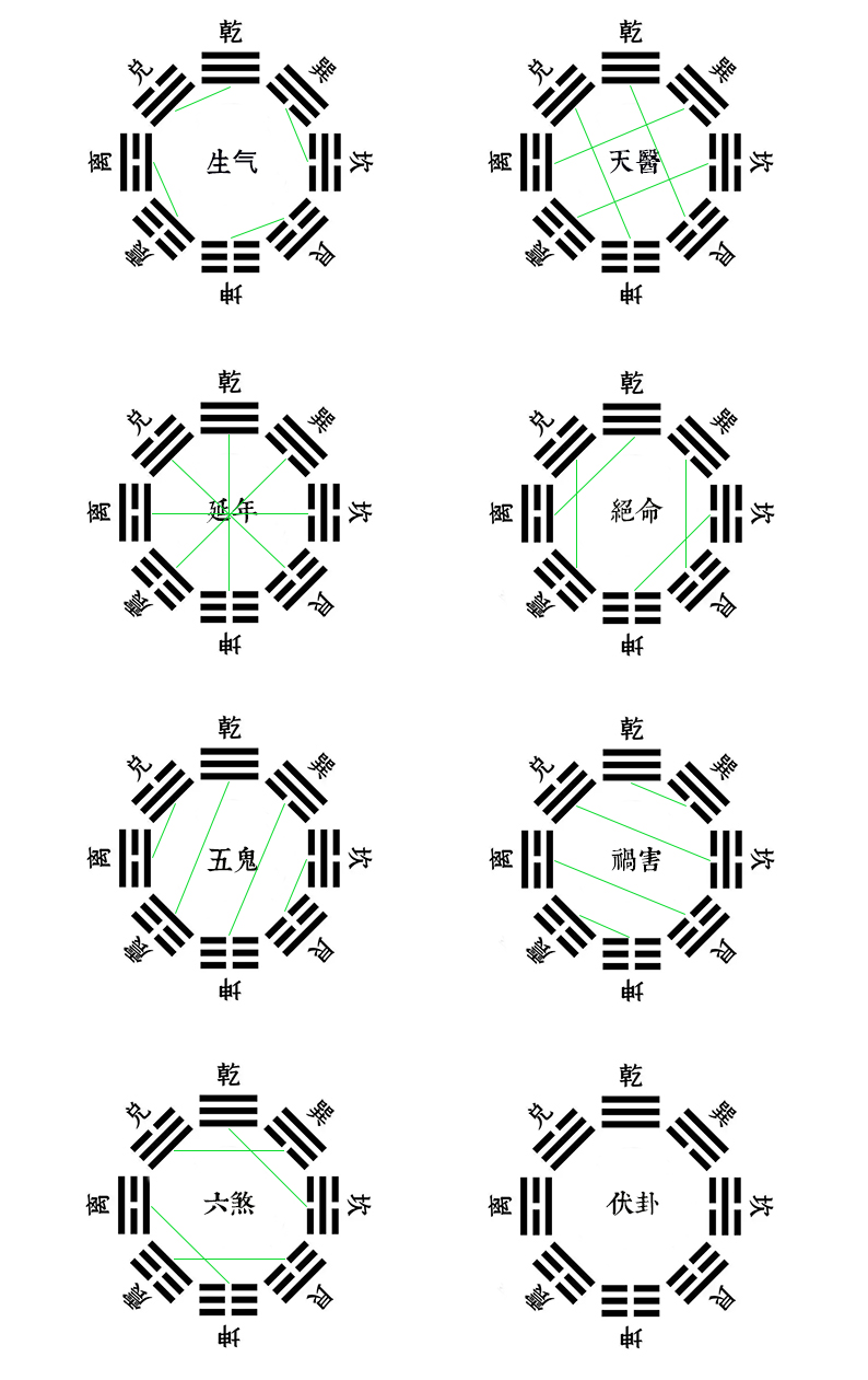 下图,源自明代湖北麻城学者彭好古所撰《阳宅大全》,图示本义非常简单,比如图一生气,即震见离、离见震;兑见乾,乾见兑;巽见坎、坎见巽,其它依次类推。再如图二天医,乾见艮,艮见乾;巽见离、离见巽,等等,其它依次类推。其余星宿,籍图对照即可。