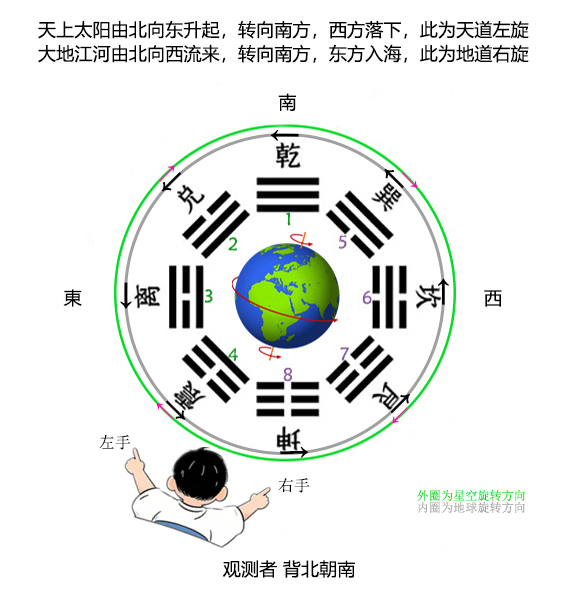 天道向左旋转,地道向右旋转。左旋是指从东向西,右旋是指从西向东。日月悬浮于天,所以随天左旋;江河依附于地,所以随地右旋。