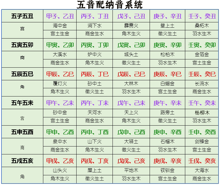 五戌(亥):甲戌、乙亥山头火(角木生火);丙戌、丁亥屋上土(徵火生土);戊戌、己亥平地木(羽水生木);庚戌、辛亥钗钏金(宫土生金);壬戌、癸亥大海水(商金生水)