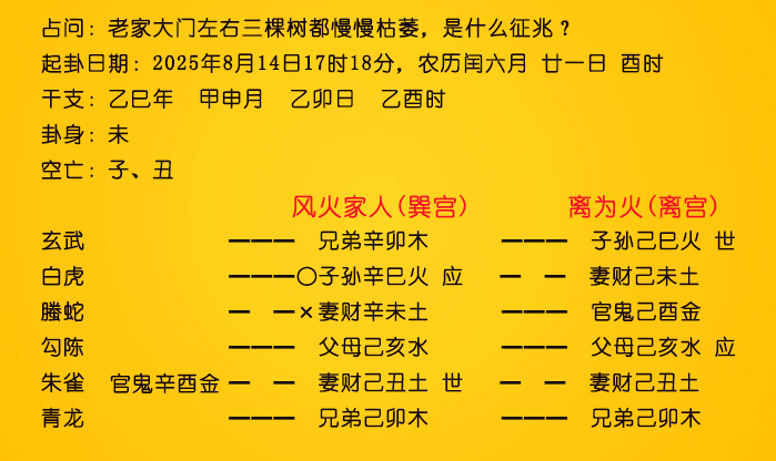 卦主祖居辛集,前日返乡发现大门两旁的三棵树都枯死了。按照传统的堪舆之说,枯木乃生气绝灭之象,僵立于大门两侧,死气直冲庭院;再者,行人过路,首先映入眼帘的是萧条之景,难免心生芥蒂。但是,卦主久居在县城,疏于照料,树木也难免凋零,这也是一个比较客观的原因。所以,还是起卦细推,才能定夺真正的吉凶。