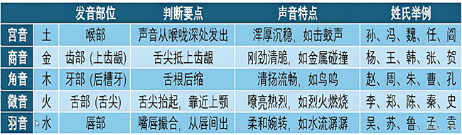 元代《永乐大典·定五姓法篇》说(译文):“阴阳师校正姓氏五音属性时,常因部分姓氏音韵特殊及普通人发音不标准而面临挑战。具体而言,商音需舌面抬起舒展,徵音需舌尖轻抵齿背,角音需舌头后缩如藏壳中,宫音需舌体在口腔中部隆起。但最终需按《切韵》等韵书标准确定:喉音为宫音,齿音为商音,牙音为角音,舌音为徵音,唇音为羽音。此法判定准确率极高。”