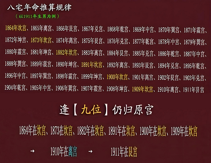 八宅风水的年命有一个硬性规定,即男女命遇到“中宫”时,“男命寄坤宫,女命寄艮宫”。